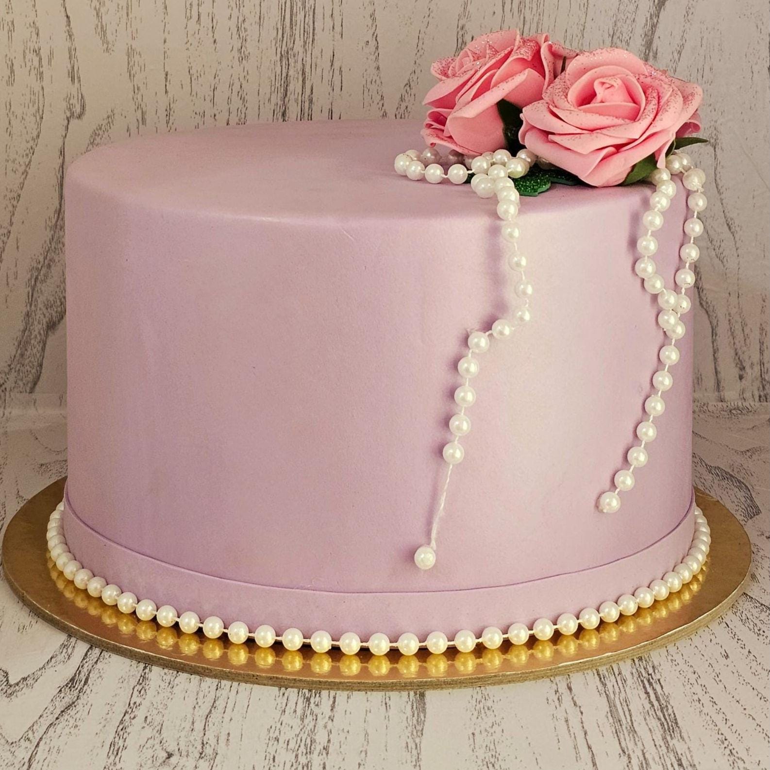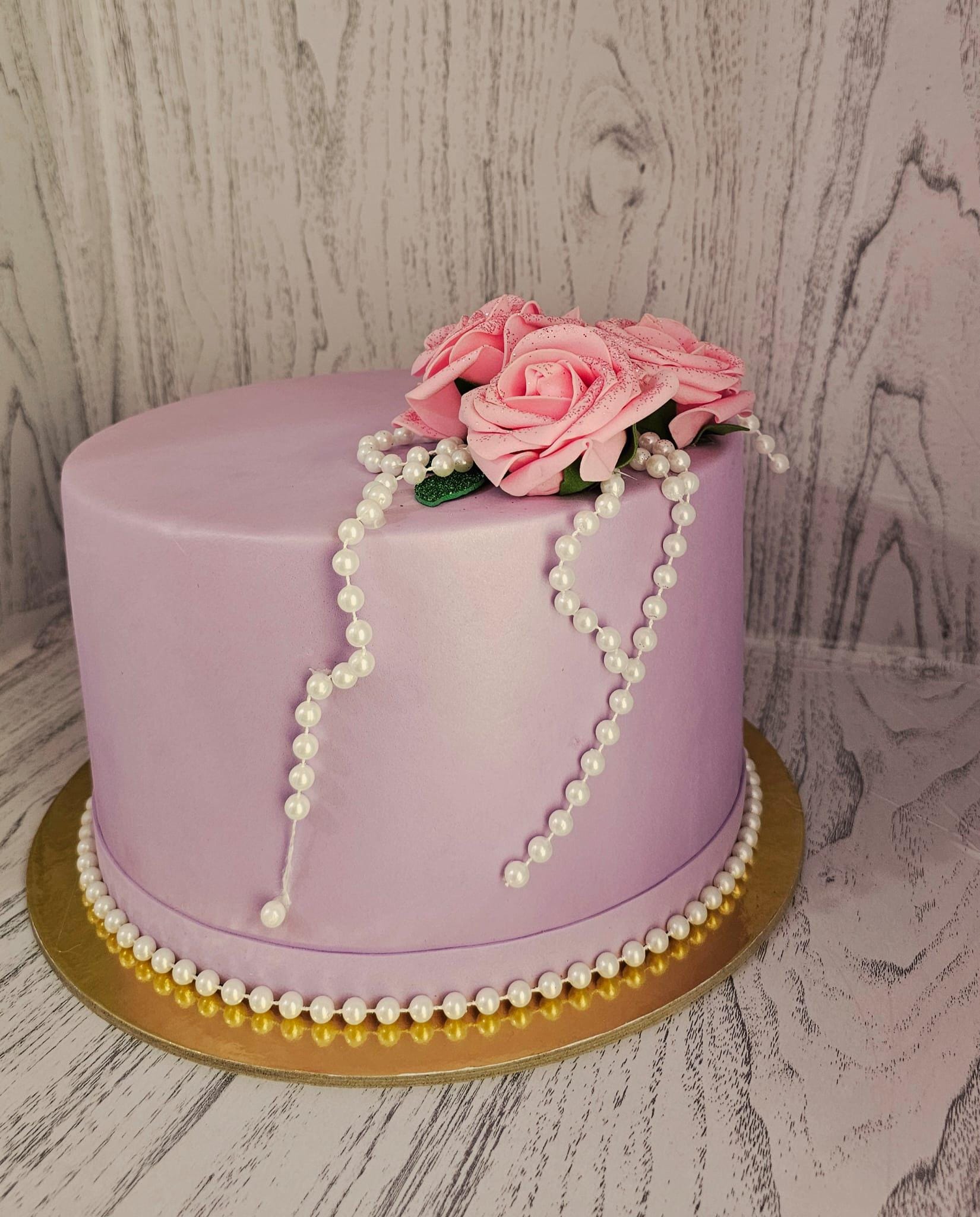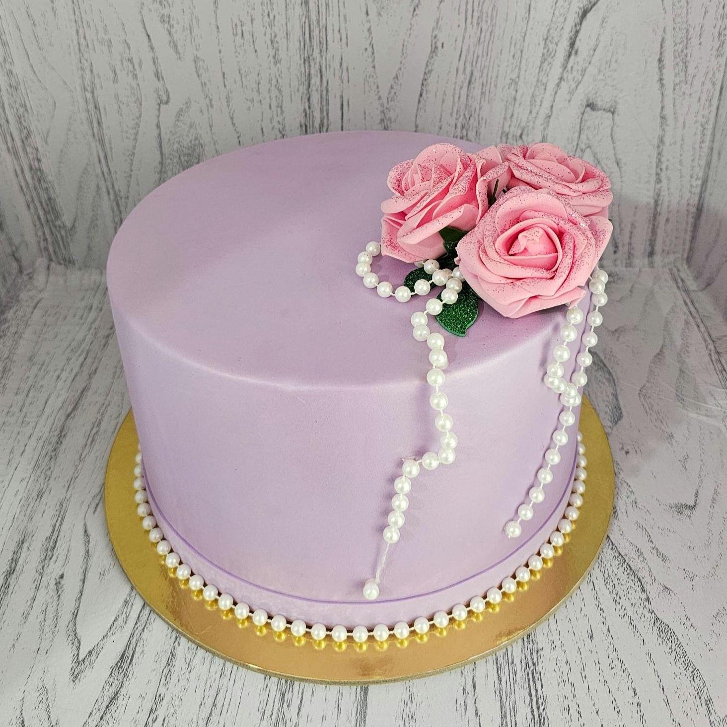 Torta finta decorativa realizzata a mano, decorata con eleganti rose rosa e perle.